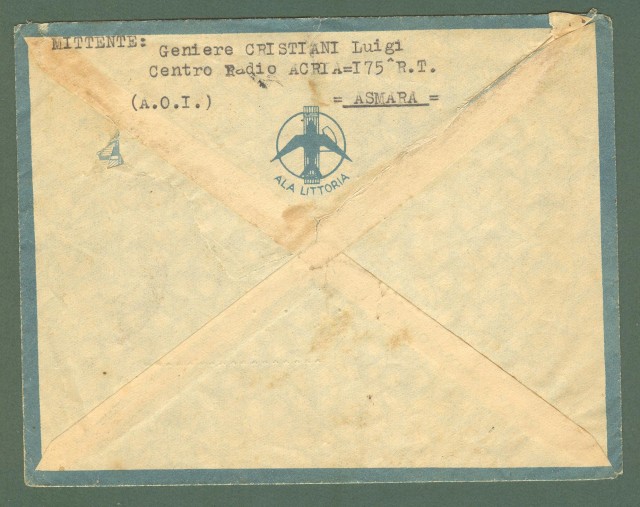Storia postale Colonie. AFRICA ORIENTALE ITALIANA. Aerogramma del 15.3.1939 da Asmara per Scigliano (Cosenza).