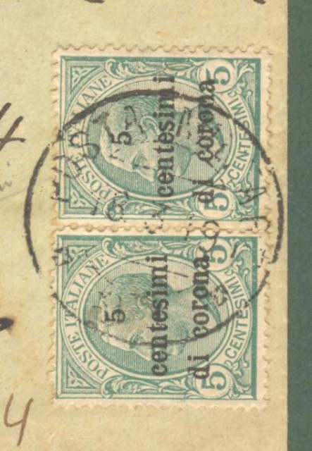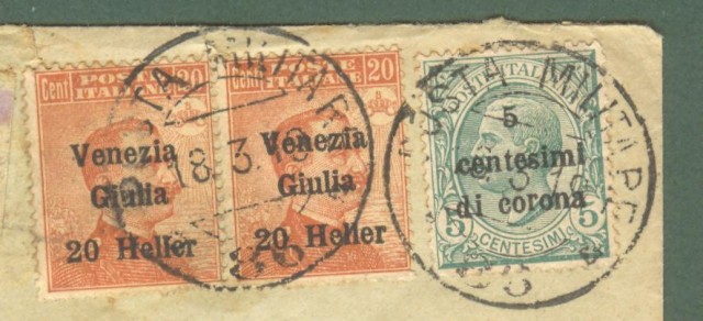 Storia postale Colonie. VENEZIA GIULIA. Raccomandata dalla POSTA MILITARE 86 a Genova il 18.03.1919. Affrancata con coppia (uno con dentellatura irregolare) 20 heller su cent. 20 arancio (Sassone V. Giulia n.31) + 3 pezzi cent.5 di corona su cent. 5 verde (Sassone Trento e Trieste n. 5). Firma Sorani. (Rif.C9083)
