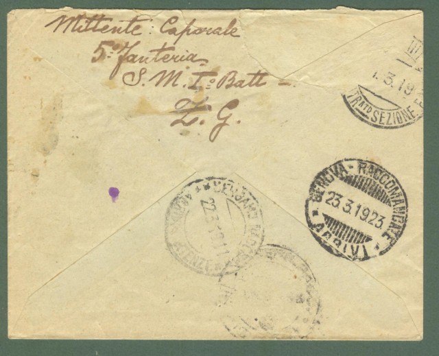 Storia postale Colonie. VENEZIA GIULIA. Raccomandata dalla POSTA MILITARE 86 a Genova il 18.03.1919. Firma Sorani.