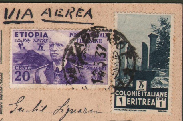 Colonie Italiane. ETIOPIA + ERITREA. Cartolina illustrata del 12.3.1937 dalla Posta Militare 130 E per Bologna. Affrancata con cent. 20 violetto (Etiopia n. 2) + lire 1 grigio (Eritrea 209). Francobolli senza difetti, buona conservazione. (Rif.C8122)