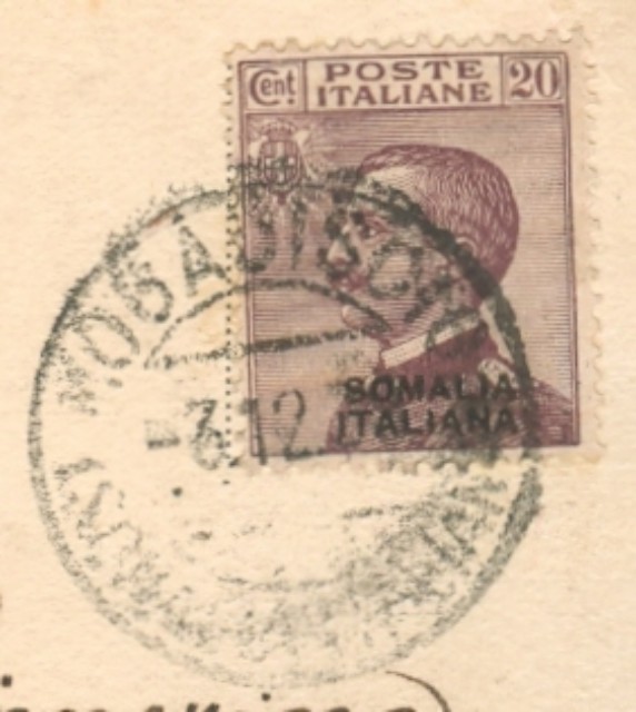 *COLONIE-OCCUPAZIONI. SOMALIA ITALIANA. Cent. 20 violetto tipo Michetti soprastampato su cartolina da Mogadiscio per Roma del 03.12.1929