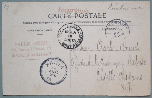 Colonie. ISOLA DI CRETA. LA CANEA. UFFICIO POSTALE ITALIANO. Bollo nero doppio cerchio privo di datario apposto in arrivo su cartolina del 21 aprile 1906 da Marsiglia e diretta a Castelli Kissano. Per l'origine di questo raro bollo riprendiamo l'articolo di Antonio Piga "un misterioso annullo postale italiano a Creta", articolo poi ripreso da F. Filanci nel suo articolo "Poste di Creta" sulla rivista Storia di Posta. Da notare che il destinatario delle nostra cartolina è lo stesso delle 11 cartoline esaminate da Antonio Piga. Conservazione ottima. (Rif.C5225)
