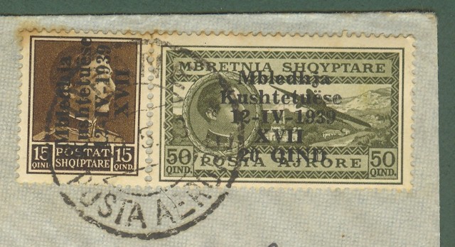 Colonie. ALBANIA. Occupazione italiana. Lettera aerea del 15.9.1939 da Tirana a Modena. Affrancata con 15 q. bruno + 20 q. su 50 q. bruno oliva (Sassone nn. 5 e 3 posta aerea). Francobolli ben dentellati, qualche dentello ossidato. (Rif.C4000)
