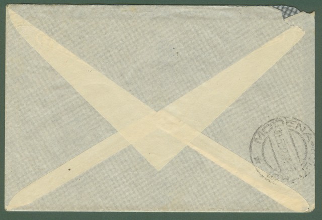 Colonie. ALBANIA. Occupazione italiana. Lettera aerea del 15.9.1939 da Tirana a Modena. Affrancata con 15 q. bruno + 20 q. su 50 q. bruno oliva (Sassone nn. 5 e 3 posta aerea).