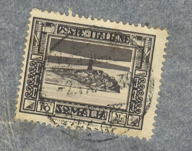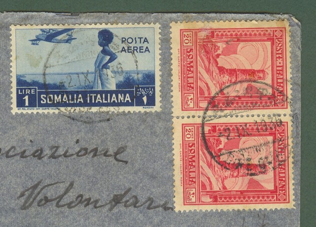 Colonie. SOMALIA ITALIANA. HURAR. Lettera aerea del 21.9.1936 da DIRE-DAOUA (annullo bilingue) a Roma. Affrancata con 2 pezzi cent. 20 carminio + cent. 10 grigio nero dentellati 14 della serie Pittorica 2'° emissione + lire 1 azzurro posta aerea.