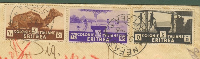 STORIA POSTALE. ERITREA. Lettera del 9.5.1935 da NEFASIT per Genova. Affrancata con cent. 5 + cent. 10 + cent. 35 serie Soggetti Africani (Sassone nn. 204,205,208). Francobolli ben dentellati. (Rif.C2887 storia postale)
