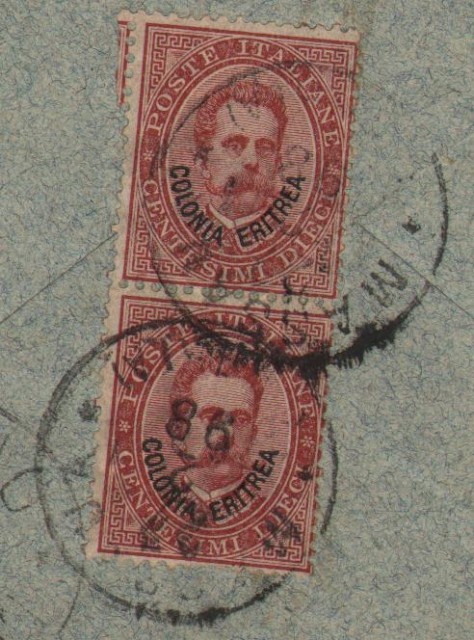 COLONIE. ERITREA. Lettera del 27.2.1898 da Massaua per Monsummano. Affrancata con coppia cent.10 carminio (Sassone n.15). Buona qualità , francobolli ben dentellati. Bollo d'arrivo. (Rif.B9905)