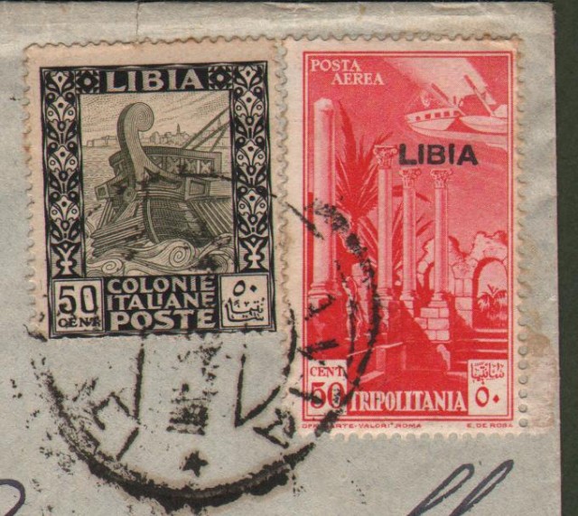 COLONIE ITALIANE. LIBIA. Lettera aerea del 28.3.1940 per Napoli. Affrancata con cent.50 serie Pittorica + cent.50 P.Aerea. Bollo ZAVIA TRIPOLI. Raro. Francobolli ben dentellati. (Rif.B9900)