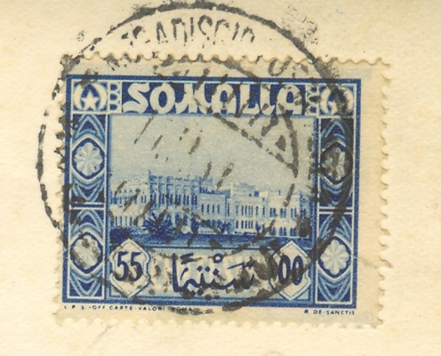 Colonie. SOMALIA A.F.I.S.. Cartolina del 25.12.1953 da Mogadiscio a Milano. Affrancata con cent. 55 azzurro serie Soggetti Africani (Sassone n. 8, Euro 100,00). Ottima qualità . (Rif.B8709 storia postale colonie)