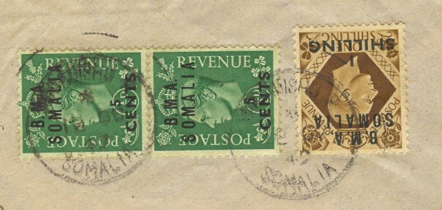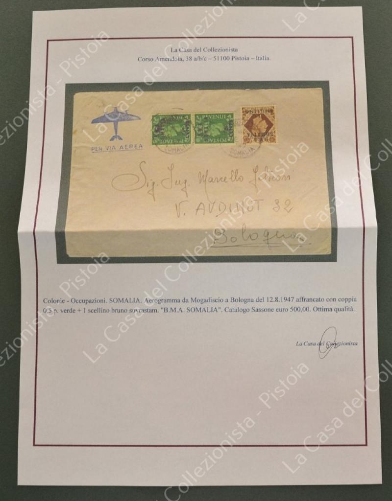 Colonie - Occupazioni. SOMALIA. Aerogramma da Mogadiscio a Bologna del 12.8.1947 affrancato con coppia 0,5 p. verde + 1 scellino bruno sovrastam. "B.M.A. SOMALIA". Catalogo Sassone euro 500,00. Ottima qualità. (Rif.B1857 storia postale)