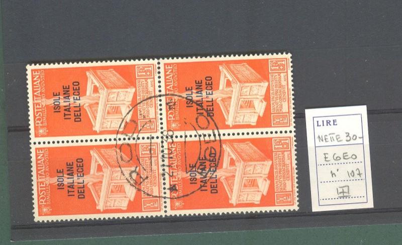 Colonie. EGEO. Serie Augusto 1938. Valore da lire 1,75 arancio in quartina usata (Sassone n. 107). Annullo autentico. Francobolli ben dentellati e senza difetti. (Rif.D2838)