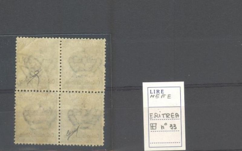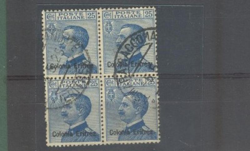 Colonie. ERITREA. Cent. 25 azzurro (Sassone n. 33) in quartina usata. Annullo originale. Ottima qualità. Firmata Biondi. (Rif.D2843)