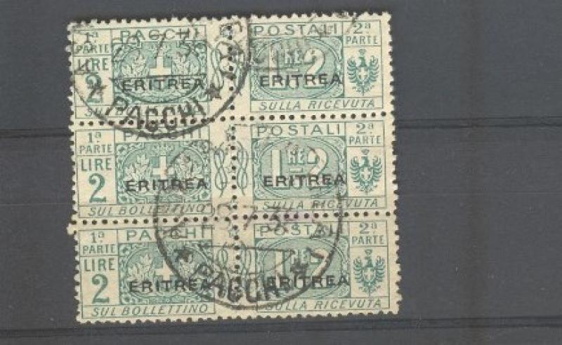 Colonie. ERITREA. Striscia di tre del 2 lire verde pacchi (Sassone n. 15, euro 60,00). Ottima qualità. Annullo originale. (Rif.D2828)