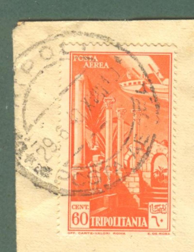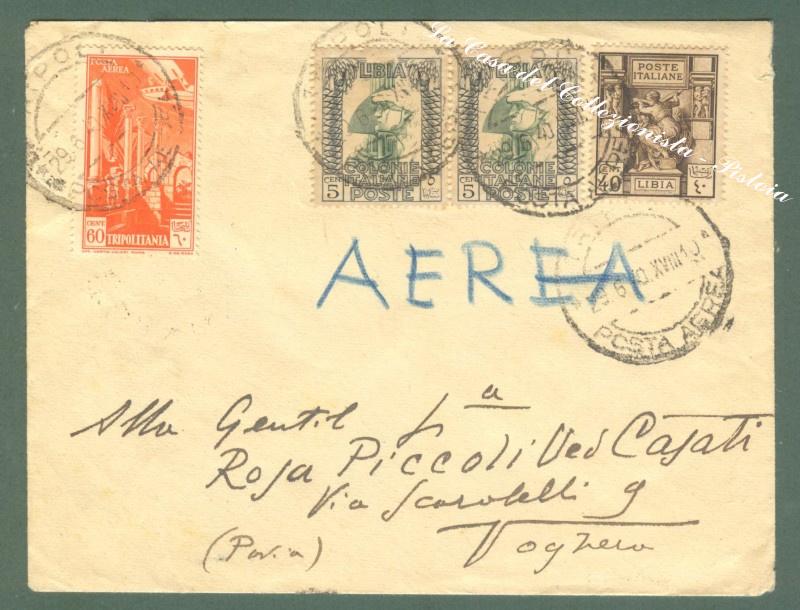 Colonie. LIBIA - TRIPOLITANIA. Lettera del 9.6.1940 da Tripoli a Voghera (Pavia) affrancata con cent. 40 bruno Sibilla (Sassone n.41) + due pezzi cent. 5 verde nero Pittorica (Sassone n.46) + cent. 60 arancio posta aerea Tripolitania (Sassone n.10). Francobolli ben dentellati e senza difetti. Lettera assai fresca. (Rif.D3311)