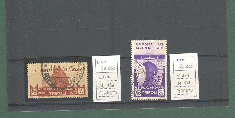 Colonie. LIBIA 1933. Settima Fiera di Tripoli. Cent. 30 bruno (Sassone n. 120), cent. 50 violetto (Sassone n. 121). Annulli originali. Firmati Biondi. (Rif.D2849)