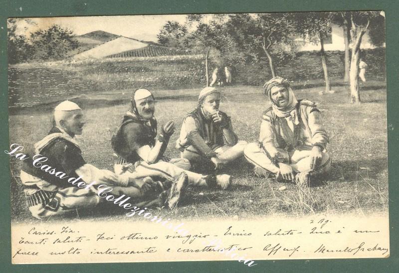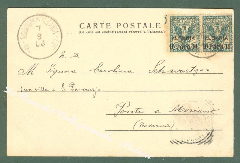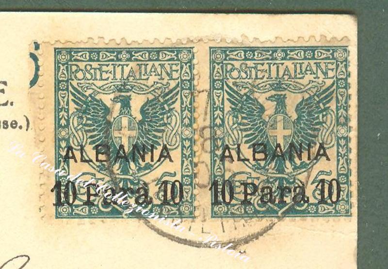 Storia postale colonie. ALBANIA. Coppia su cartolina da Scutari del 1906.