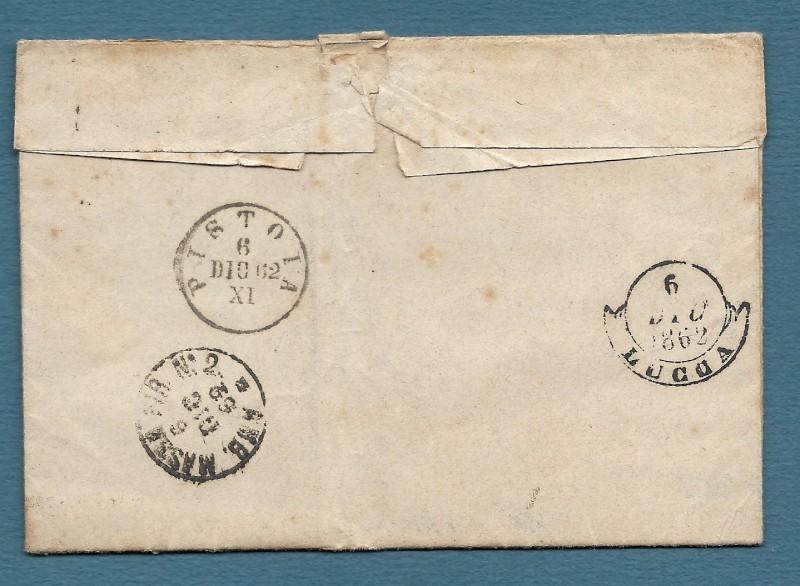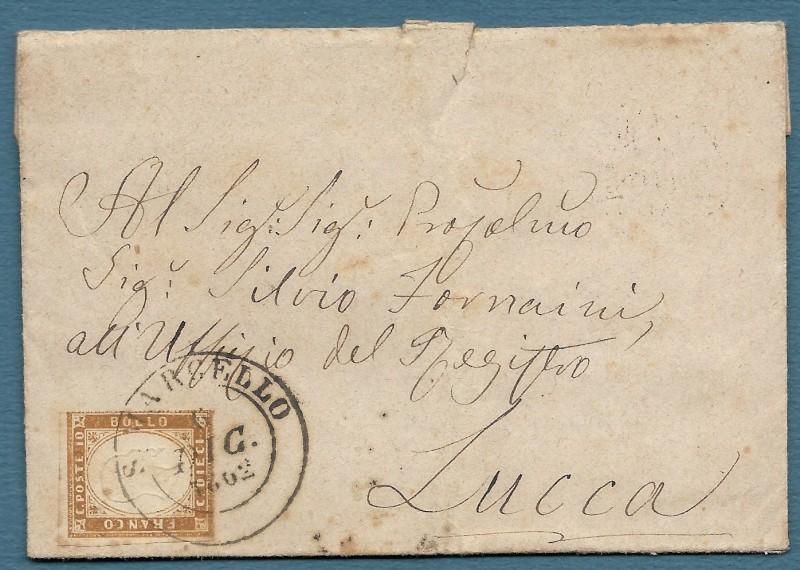 Antichi Stati. SAN MARCELLO DOPPIO CERCHIO annullatore di cent. 10 Sardegna (2 margini corti). Lettera del 6.2.1862 per Lucca. Completa del testo. (Rif.F6955)