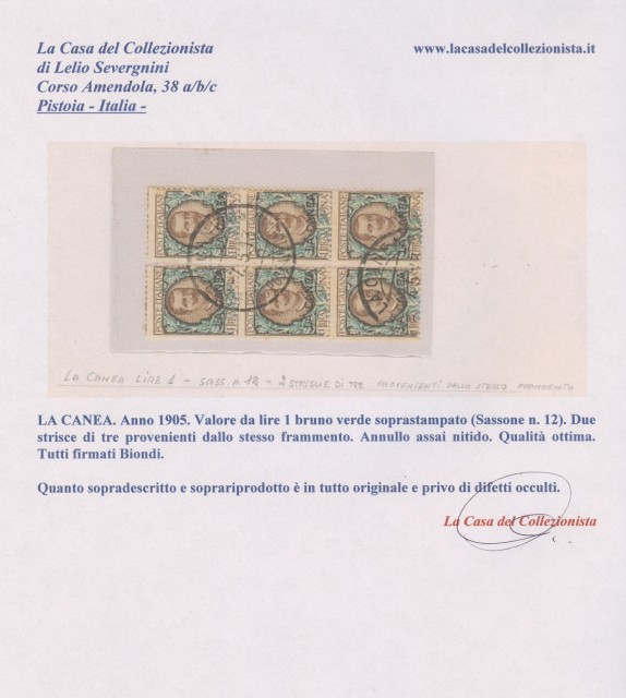 Colonie. LA CANEA. Anno 1905. Valore da lira 1 bruno verde soprastampato (Sassone n. 12). Due strisce di tre provenienti dallo stesso frammento. Annullo assai nitido. Qualità ottima. Tutti firmati Biondi. (Rif.B6476)