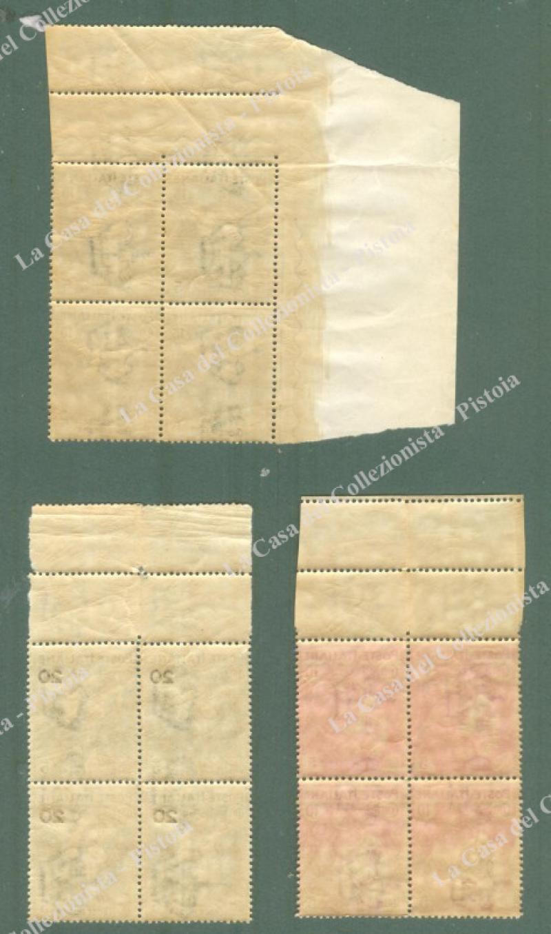 FRANCOBOLLI ITALIA RERNO. PRO CROCE ROSSA cente. 10+5 rosa, cent. 15+5 grigio, cent. 20 su cent. 15+5 grigio (Sassone nn.102,103 e 105) in quartine con gomma integra.