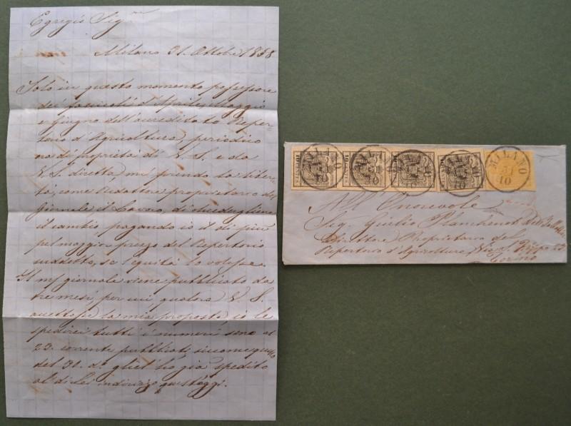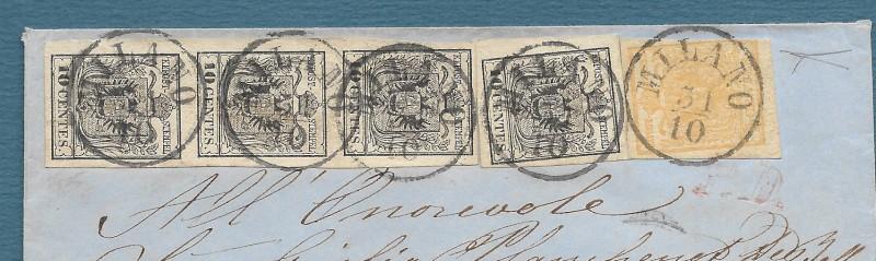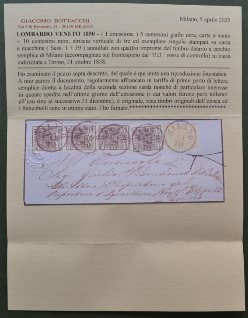 LOMBARDO VENETO 1850 (I emissione). 5 centesimi giallo ocra carta a mano + 10 centesimi nero, striscia verticale di tre ed esemplare singolo, stampati su carta a macchina (Sassone numeri 1 + 19) annullati con quattro impronte del timbro datario a cerchio semplice di Milano (accompagnate sul frontespizio dal "PD" rosso di controllo) su busta per Torino del 31 ottobre 1858 (ultimo giorno di validità). Perfetta e molto fresca. Conservata la corrispondenza. Certificato Giacomo Bottacchi. (Rif.F7762)