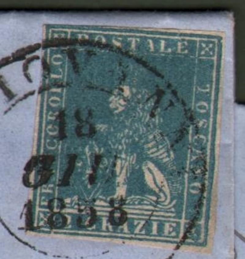 TOSCANA. Lettera del 18 giugno 1858 da San Giovanni a Firenze. Affrancata con 2 crazie azzurro (Sassone n. 13 filigr. linee ondulate). Il francobollo è ben marginato con tre ottimi margini bianchi ed è, sul quarto, appena a filo in un punto. Completa del testo e assai fresca.