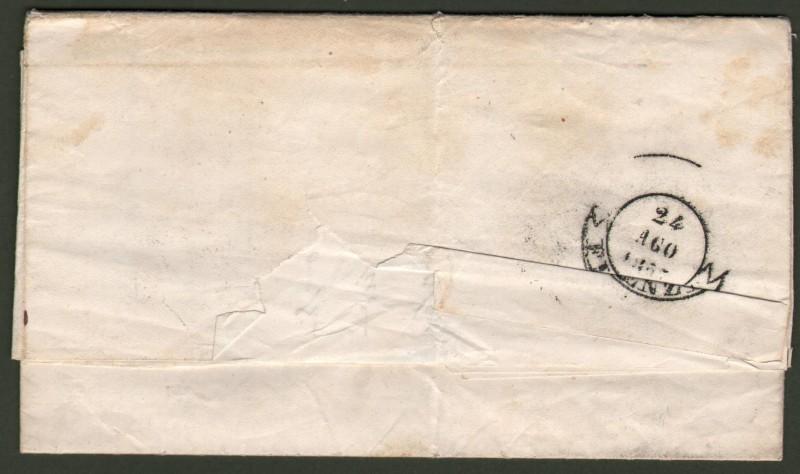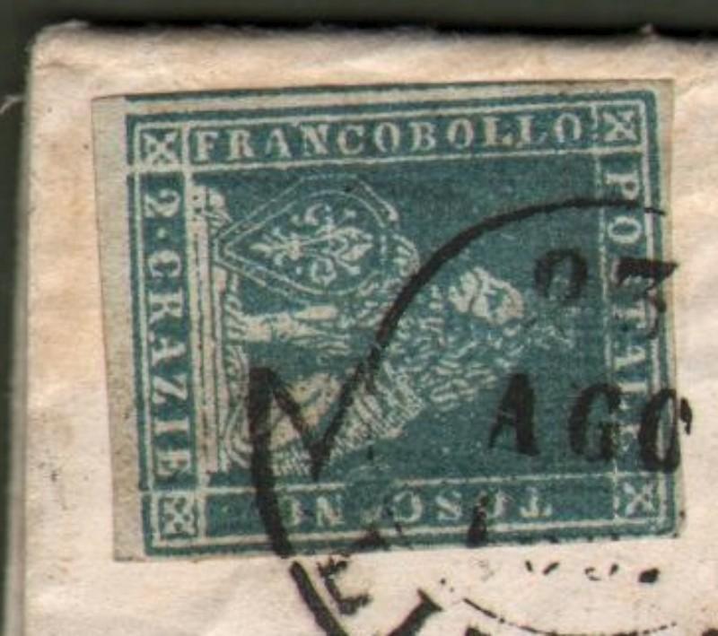 TOSCANA. Lettera del 23 agosto 1857 da Livorno a Firenze. Affrancata con 2 crazie azzurro chiaro su grigio (Sassone n. 5). Il francobollo è di grande qualità: 4 margini bianchi di cui uno ha la parte del vicino nero (quello inferiore) è interspazio di gruppo. Fresca e completa del testo.