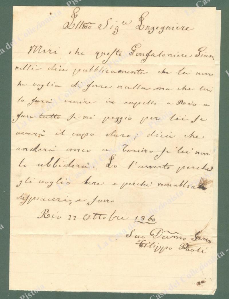 TOSCANA. RIO doppio cerchio nero su lettera del 25.10.1860 per Piombino. Completa di testo. (Rif.E1861)