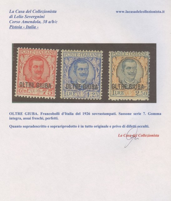 Colonie. OLTRE GIUBA. Francobolli d'Italia del 1926 sovrastampati. Sassone serie 7. Gomma integra, assai freschi, perfetti. Catalogo euro 400,00. (Rif.B4379 francobolli)
