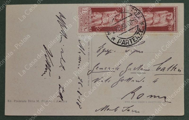 AFRICA ORIENTALE ITALIANA. Coppia cent 10 Bimillenario Augusto su cartolina per Roma del 26.8.1938. Francobolli ben dentellati. (Rif.F7807)