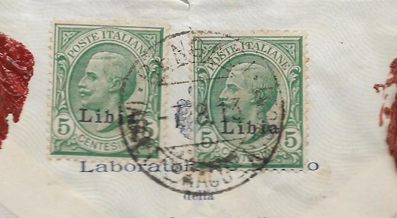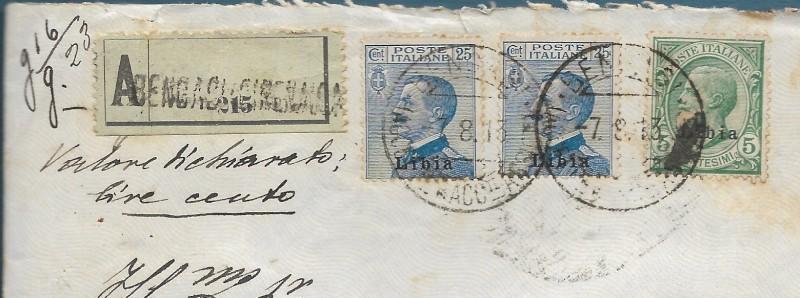Colonie. LIBIA. Assicurata per lire cento del 7.8.1913 da Bengasi a Massa Cozzile. Affrancata con 3 pezzi cent. 5 Leoni e 2 pezzi cent. 25 Michetti soprastampati.