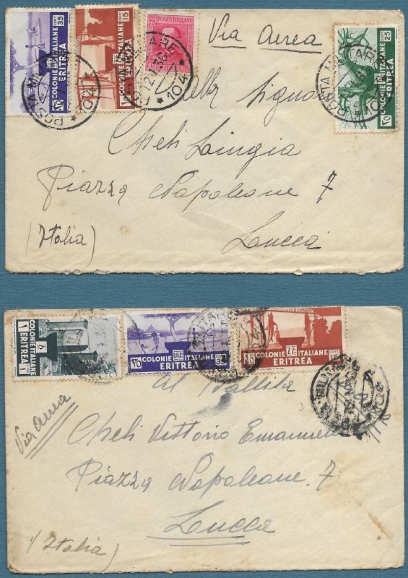 Colonie. ERITREA. 2 lettere aeree del 1936 per Lucca con bollo della P.M. 104. Francobolli ben dentellati ma con punti di ingiallimento. (Rif.F3364)