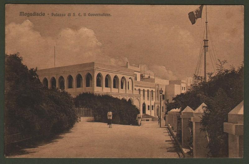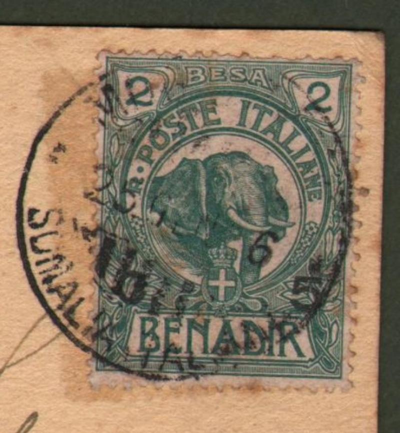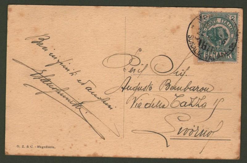 Colonie. SOMALIA. Centesimi 5 su base verde (Sassone n. 11) su cartolina da Mogadiscio a Livorno. Francobollo ben dentellato e senza difetti. (Rif.D7448)