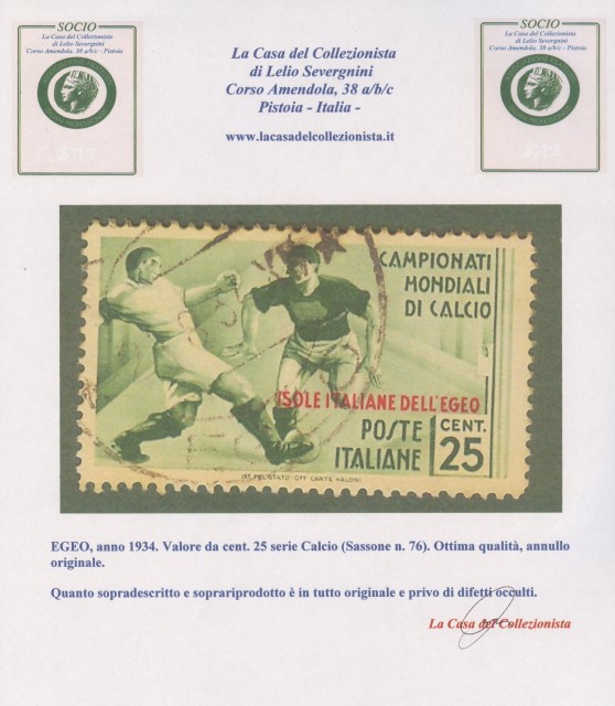 EGEO, anno 1934. Valore da cent. 25 serie Calcio (Sassone n. 76). EGEO, anno 1934. Valore da cent. 25 serie Calcio (Sassone n. 76).