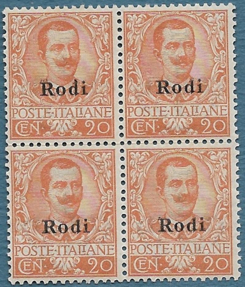 EGEO. RODI. Quartine cent. 20 arancio. (Sassone n. 9). Fresca, senza traccia di linguella. (Rif.F3480)