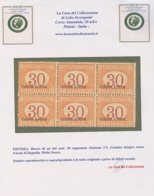 ERITREA. Blocco di sei del cent. 30 segnatasse (Sassone 17). ERITREA. Blocco di sei del cent. 30 segnatasse (Sassone 17).