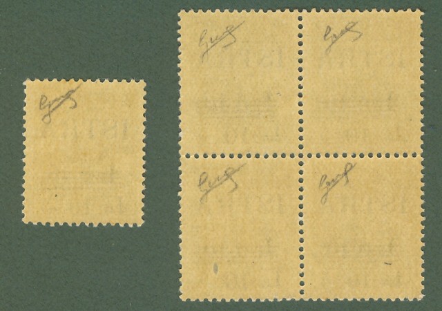 ISTRIA (Pola). OCCUPAZIONE JUGOSLAVA. Quartina + UN ESEMPLARE SINGOLO del 10 lire su 10 centesimi su 5 centesimi (Sassone n.39). Tutti i francobolli sono firmati dal perito Biondi. La qualità è buona (gomma integra senza traccia di linguella) ad eccezione di un francobollo della quartina che presenta un'abrasione alla gomma. (Rif.C3974)