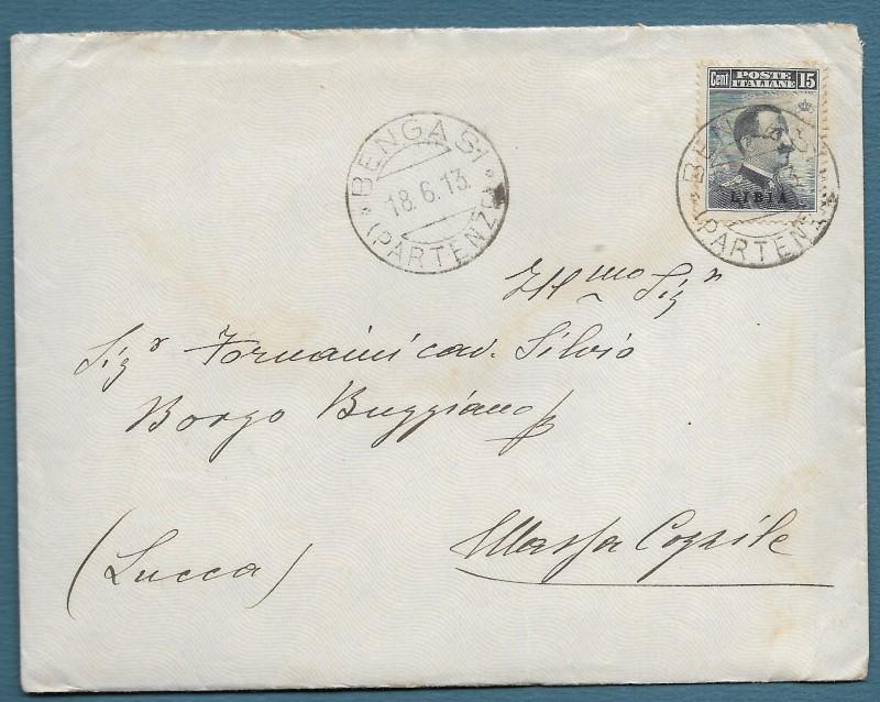 LIBIA. Centesimi 15 grigio su lettera da Bengasi del 1913.