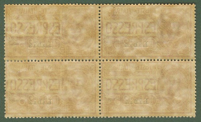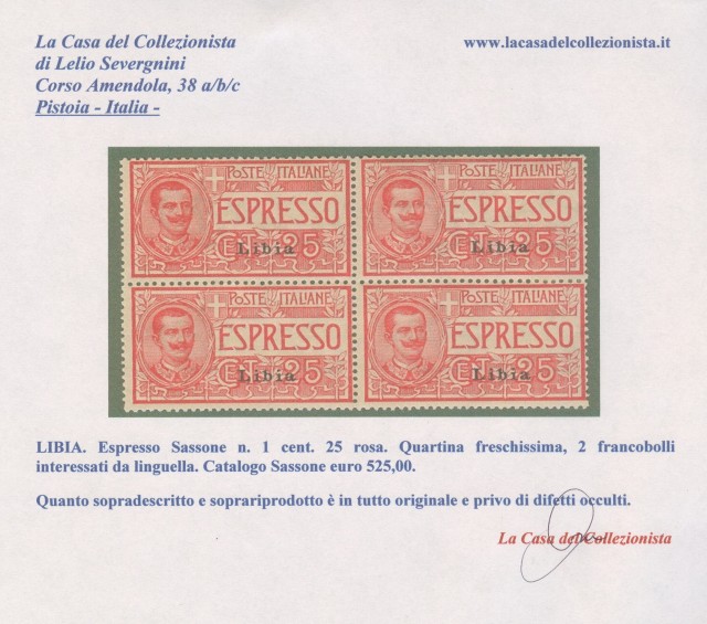 LIBIA. Espresso Sassone n. 1 cent. 25 rosa. Quartina freschissima, 2 francobolli interessati da linguella. Catalogo Sassone euro 525,00. (Rif.B4415)