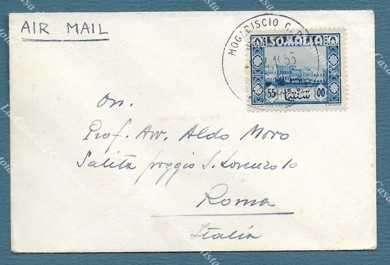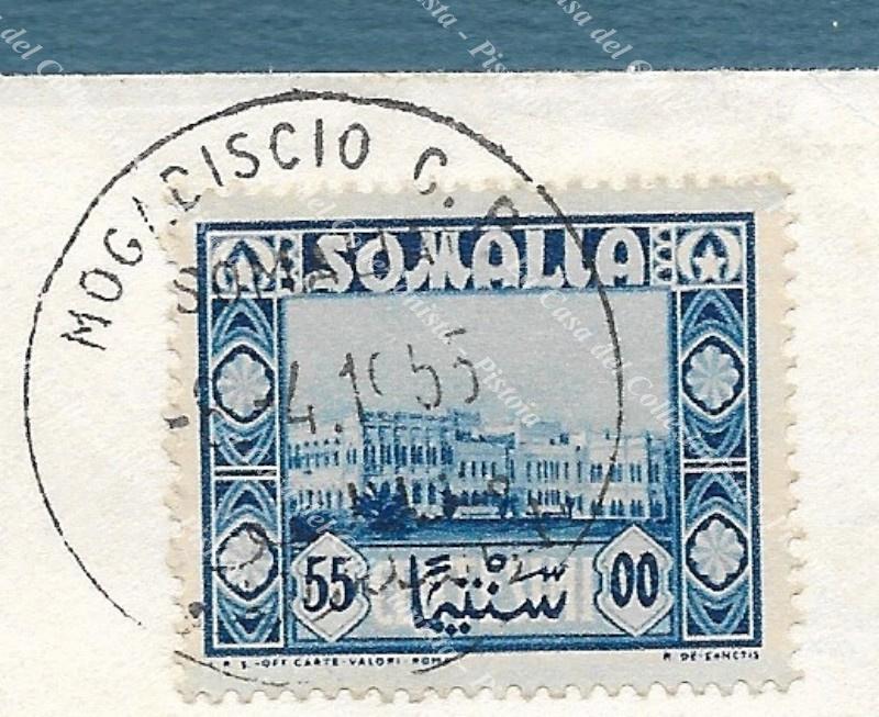 SOMALI A.F.I.S. Biglietto del 8 aprile 1955 da Mogadiscio per Roma affrancata con cent.55 azzurro. Ben dentellato, ottima qualità. (Rif.F2116)