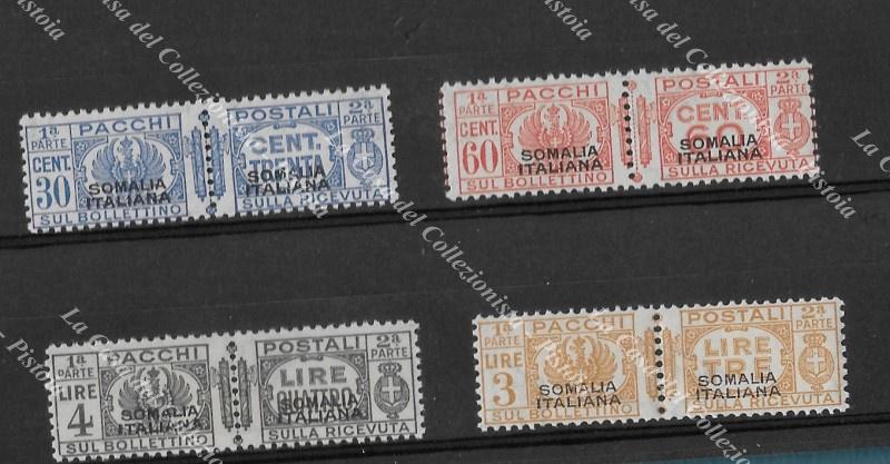 SOMALIA ITALIANA. Pacchi postali da cent. 30, cent. 60, lire 3 e lire 4 (Sassone nn. 57, 60, 62, 63). Molto freschi e senza traccia di linguella. (Rif.F3457)