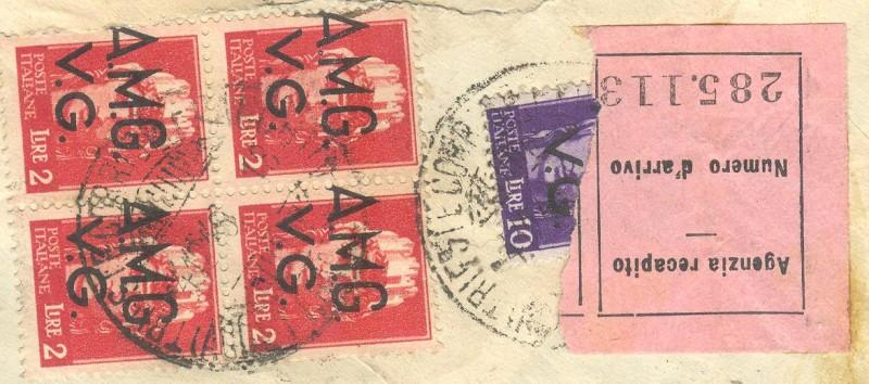 Storia postale colonie e occupazioni. TRIESTE - VENEZIA GIULIA. Lettera doppio porto raccomandata espresso da Trieste a Roma del 4.12.1946. Affrancata con lire 10 violetto (Sassone n.11) + lire 10 espresso azzurro (Sassone n.1) + quartina lire 2 carminio (Sassone n.9). La quartina del 2 lire ha la sovrastampa spostata a sinistra. Tutti i francobolli sono ben dentellati. (Rif.D5526)