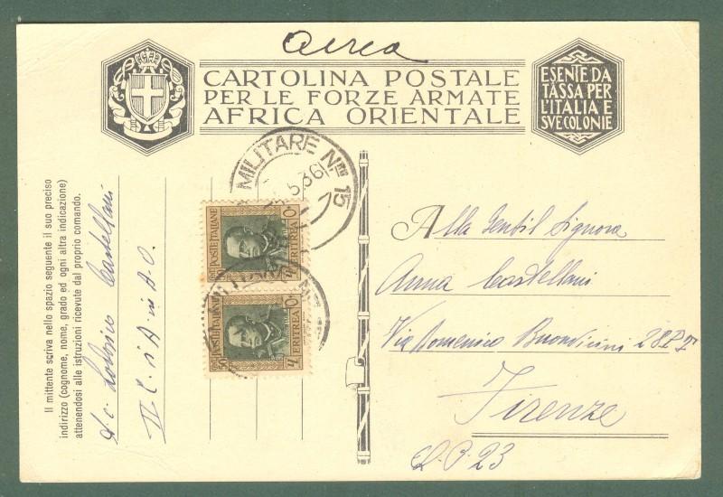 Storia postale colonie. ERITREA. Coppia cent.50 su cartolina per le forze armate.