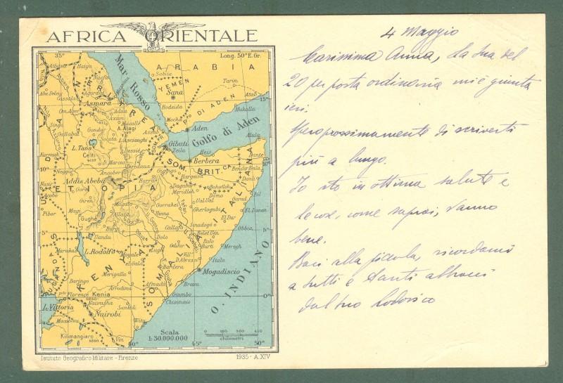 Storia postale colonie. ERITREA. Coppia cent.50 (Sassone 197) su cartolina per le forze armate. Dalla POSTA MILITARE 15 il 4.5.1936. Ottima qualità. (Rif.D4781)