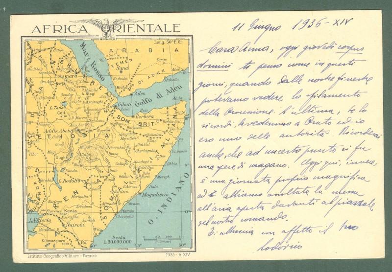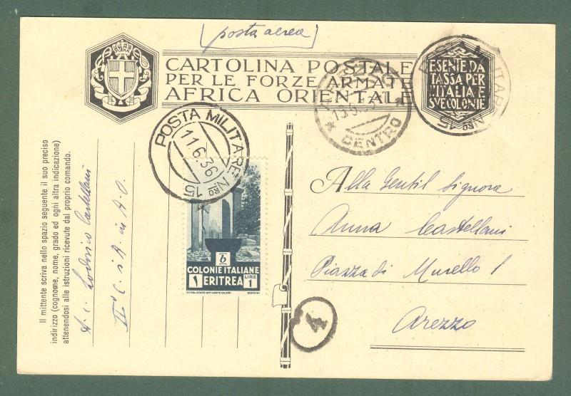 Storia postale colonie. ERITREA. Lire 1 grigio su cartolina postale per le forze armate. Dalla Posta Militare 15 a Arezzo del 11.6.1936. Ottima qualità. (Rif.D4787)