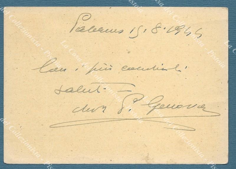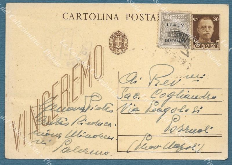 Storia postale. OCCUPAZIONI e COLONIE. SICILIA OCCUP. ANGLO - AMERICANA. Cartolina postale cent. 30 Vinceremo con aggiunto cent. 30 (Sassone n. 3). Da Palermo a Pozzuoli 15.8.1944. (Rif.F5049)