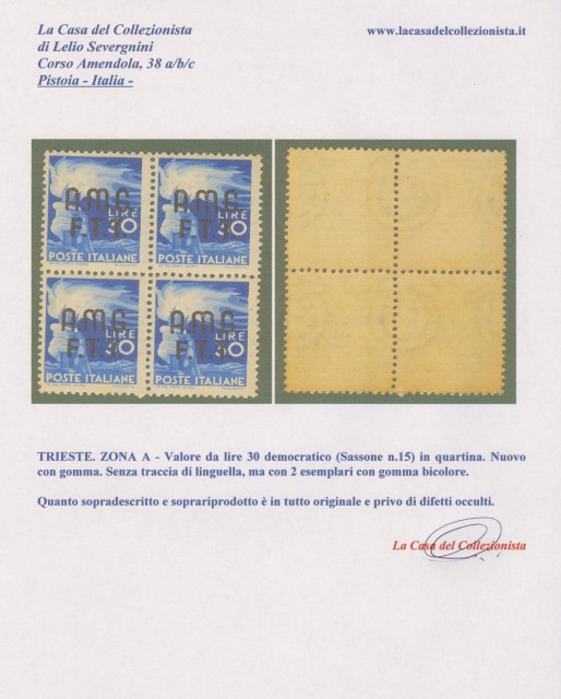 TRIESTE. ZONA A - Valore da lire 30 democratico(Sassone n.15)in quartina. Nuovo con gomma. Senza traccia di linguella, ma con 2 esemplari con gomma bicolore.(Rif.B8764)