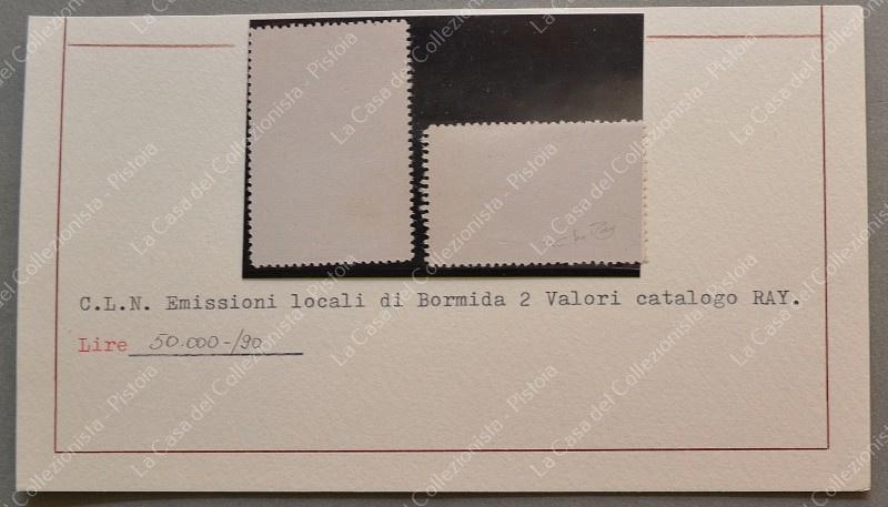 C. L. N. VALLE BORMIDA 1945. Valore da cent. 5 bruno rosso (Sassone n.9) e lire 1,25 bistro arancio (sassone n.19, firma Raybaudi). Senza gomma. (Rif.F6369)