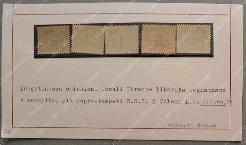 LUOGOTENENZA. EMISSIONI LOCALI FIRENZE LIBERATA 1944. Quattro segnatasse e un recapito R.S.I. sovrastampati. Senza traccia di linguella, gomma integra. (Rif.F6366)
