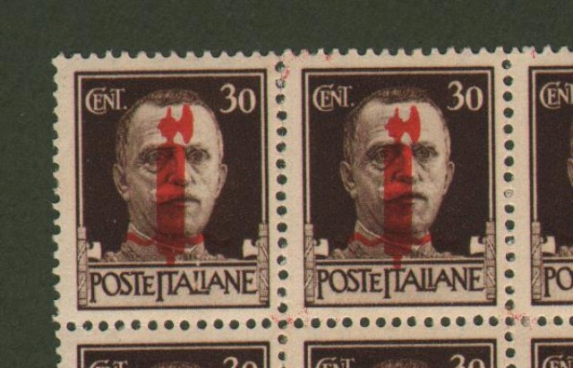 R.S.I.. SOVRASTAMPA ROSSO ARANCIO. Cent. 30 bruno soprastampato (Sassone 492 E). Blocco di 40 pezzi. Firmati dal perito Biondi.