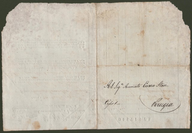 Storia postale Prefilatelia. LETTERA DI CONDOTTA del 26 Marzo 1829 per merci da Pesaro a Perugia. Mancanza di carta agli angoli. (Rif.C8156)